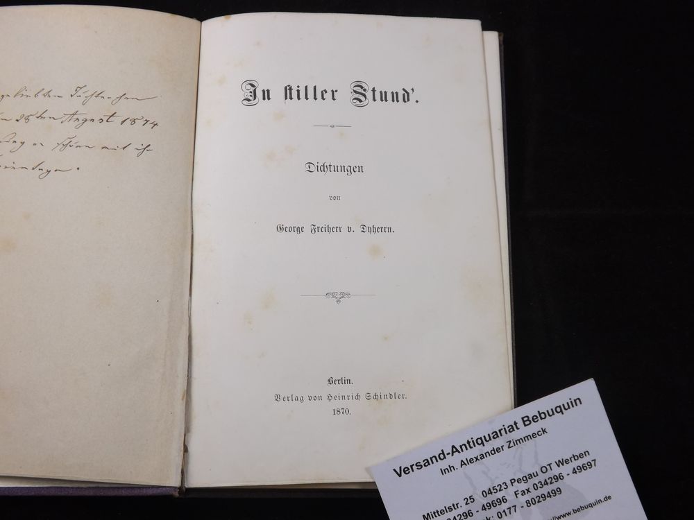 DYHERRN, George Freiherr von: In stiller Stund’. Dichtungen. Berlin (Schindler), 1870. X, 167 S. OLn. mit üppiger Deckel-Goldprägung. Kapitale leicht angeplatzt, WaV. EA des Erstlings Kosch III, 340. Georg Freiherr von Dyherrn (auch Georg von Dyhrn; * 1. Januar 1848 in Glogau, Landkreis Glogau, Provinz Schlesien; † 27. Dezember 1878 in Rothenburg an der Oder) war ein deutscher Dichter und Novellist. (Wikipedia)