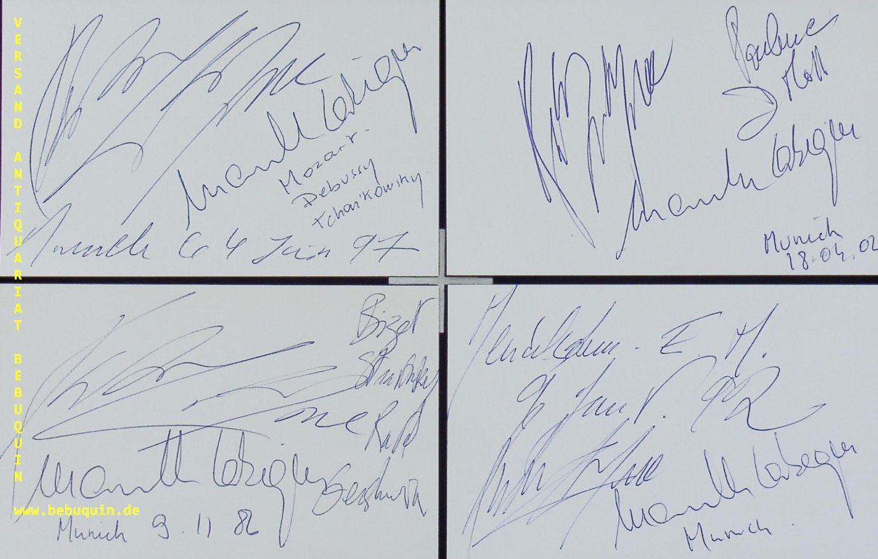 LABEQUE, Katia & Marielle (Pianistinnen): 5 eigenhändig signierte und datierten Autogrammkarten. München (Philharmonie), 1982, 1989, 1992, 1997, 2002. 8 x 12,5 cm. 5 Karteikarten. Die Schwestern Katia (* 11. März (nach anderen Angaben: 3. März) 1950 in Bayonne) und Marielle Labèque (* 6. März 1952 in Bayonne) sind ein bekanntes französisches Klavierduo der Gegenwart.