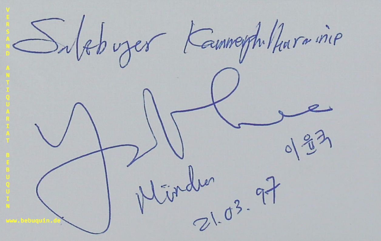 LEE, Yon K. (Dirigent): eigenhändig signierte und datierte Autogrammkarte. München (Philharmonie), 21.3.1997. 8 x 12,5 cm. Karteikarte. Yoon Kuk Lee (born August 24, 1953) is a South Korean-born Austrian Composer and conductor. (Wikipedia)
