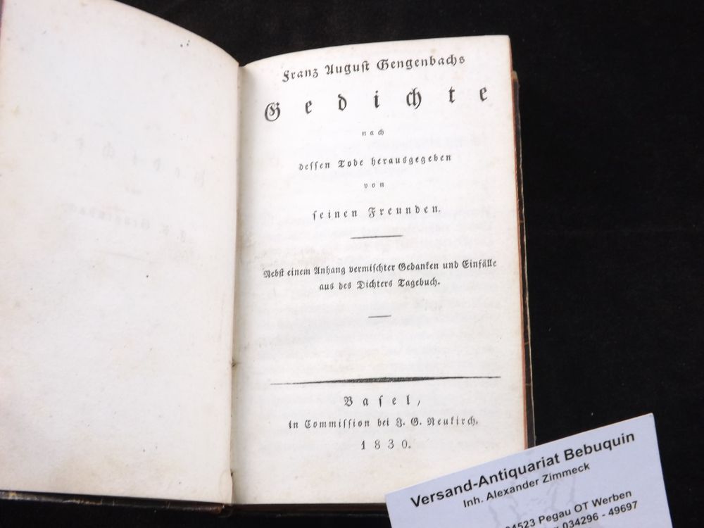 GENGENBACH, Franz August: Gedichte. Nach dessen Tode hrsg. von seinen Freunden. Nebst Anhang. Basel (Neukirch), 1830. kl. 8°. XXI, 190 S. HLdr. der Zeit Kanten leicht berieben. EA der einzigen Veröffentlichung des 1829 mit 21 Jahren an Rachitis verstorbenenen Verfassers.