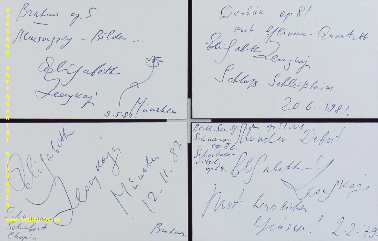 LEONSKAJA, Elisabeth (Pianistin): 15 eigenhändig signiertes und datiertes Autogrammkarten mit zahlreichen eigenhändigen Programmbeschreibungen. München (Herkulessaal), 1979 – 1995. 8 x 12,5 cm. 15 Karteikarten. Elisabeth Leonskaja (* 23. November 1945 in Tiflis, Sowjetunion) ist eine russische Pianistin. (Wikipedia)