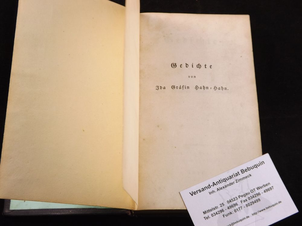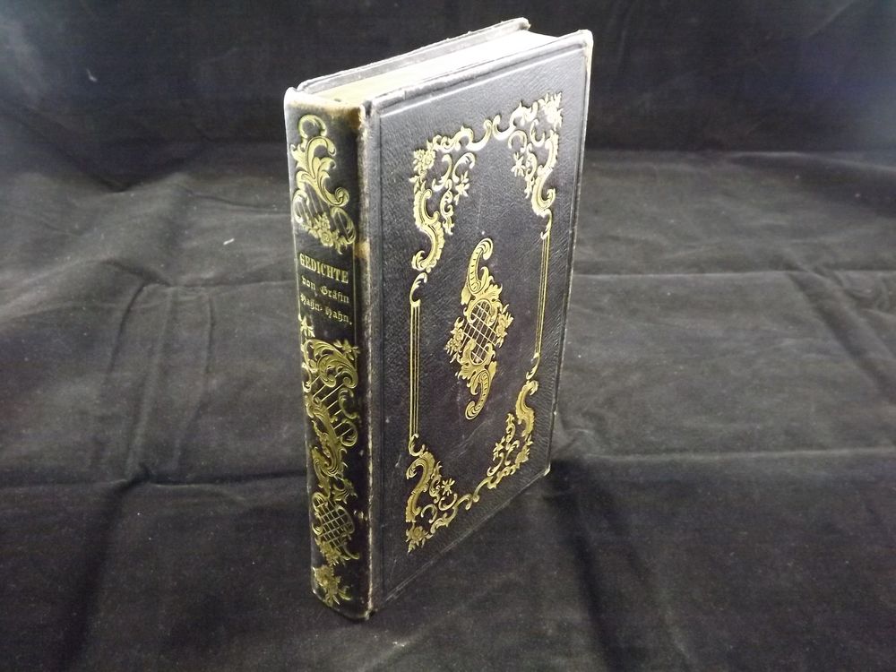 HAHN-HAHN, Ida Gräfin: Gedichte. Leipzig (Brockhaus), 1835. XII, 308 S. Ldr. der Zeit mit überaus reicher Biedermeier-Goldprägung. Sehr seltene EA des Erstlingswerks WG² 1. Mit angebunden die dritte Veröffentlichung der Autorin aus dem Folgejahr: „Venezianische Nächte“ ebenfalls in EA mit VI, 192 S. WG² 3.