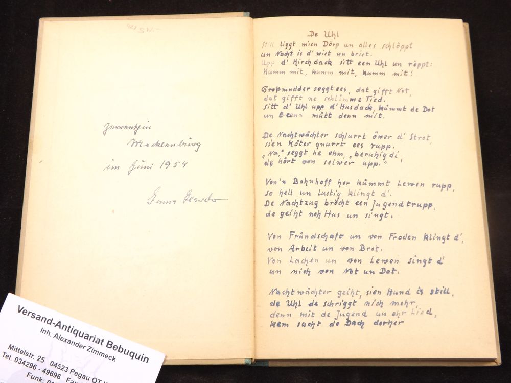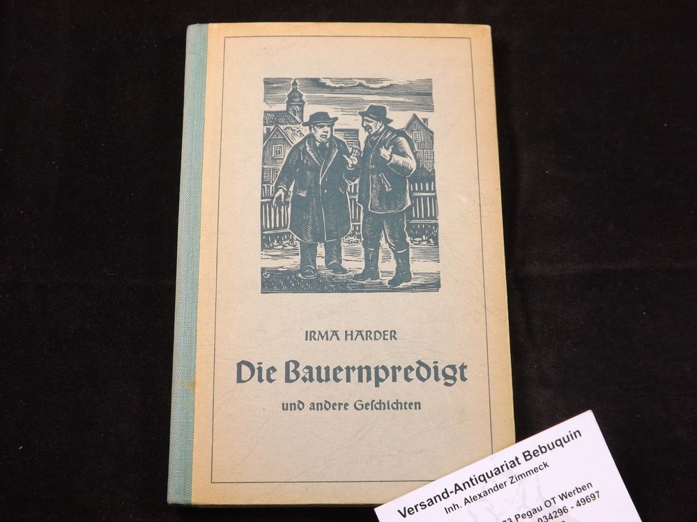 HARDER, Irma: Die Bauernpredigt und andere Geschichten. Berlin (Neues Leben), 1953. 95 S. mit Holzschnitten von Erwin Görlach. ill. OHLn. kaum gebräunt. EA des Erstlingswerks mit einer eigenhändigen Autorenwidmung sowie einem ebenso eigenhändigen Gedicht der Autorin in Mundart auf Vorsatz.