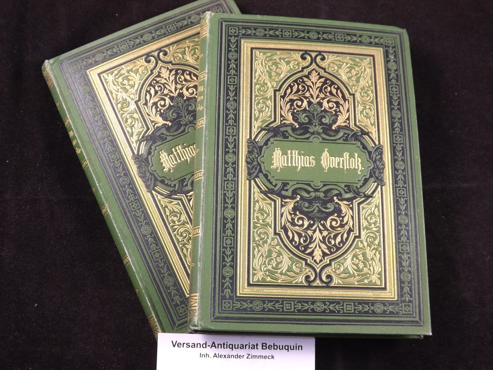 HARMENING, Ernst: Matthias Overstolz. Roman aus Kölns Vergangenheit. 2 Bände. Mülhausen (Bufleb´sche), 1881. VI, 188, 2 Bl.,191 S. OLn. mit reicher Gold- und Schwarzprägung. NaT. EA des Erstlingswerks des Juristen, Schriftstellers und Mitglieds des Deutschen Reichstags mit einer fünfzeiligen, eigenhändigen Verfasserwidmung für Gustav Freytag.