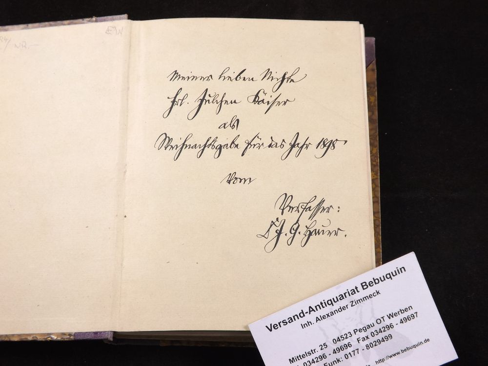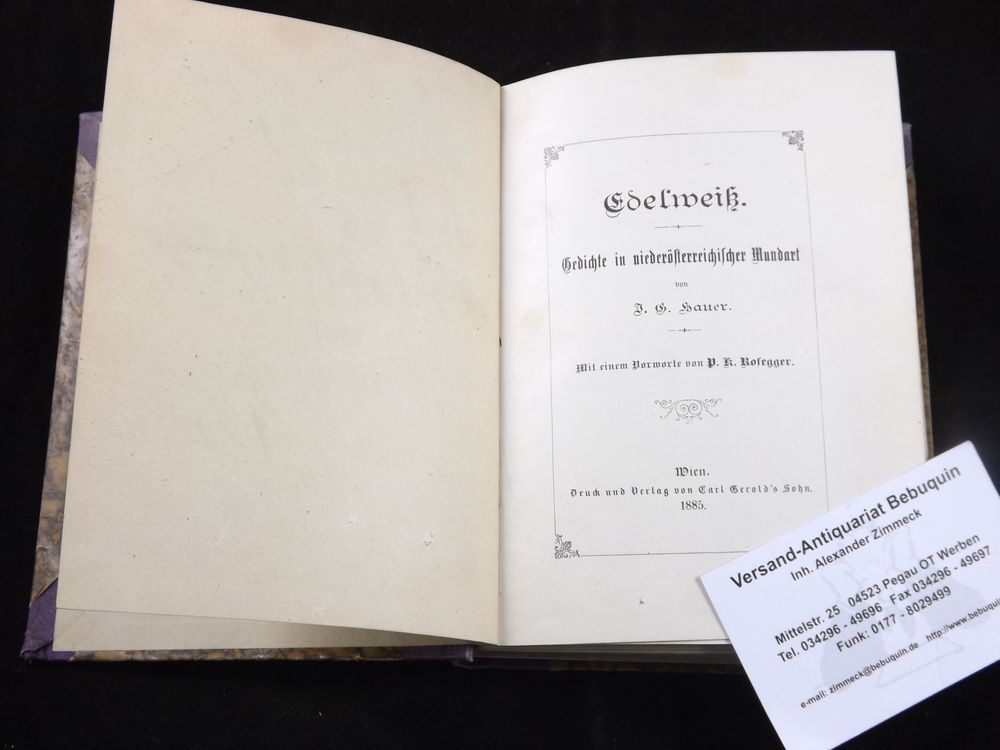 HAUER, J. G.: Edelweiß. Gedichte in niederösterreichischer Mundart. Mit einem Vorwort von Peter Rosegger. Wien (Gerold), 1885. 2 Bl., 290 S., 1 Bl. HLn. der Zeit mit goldgeprägtem Rücken. Rücken geblichen. EA der ersten Veröffentlichung mit eigenhändiger, datierter und signierter Widmung des Verfassers. Kosch VII, 492.