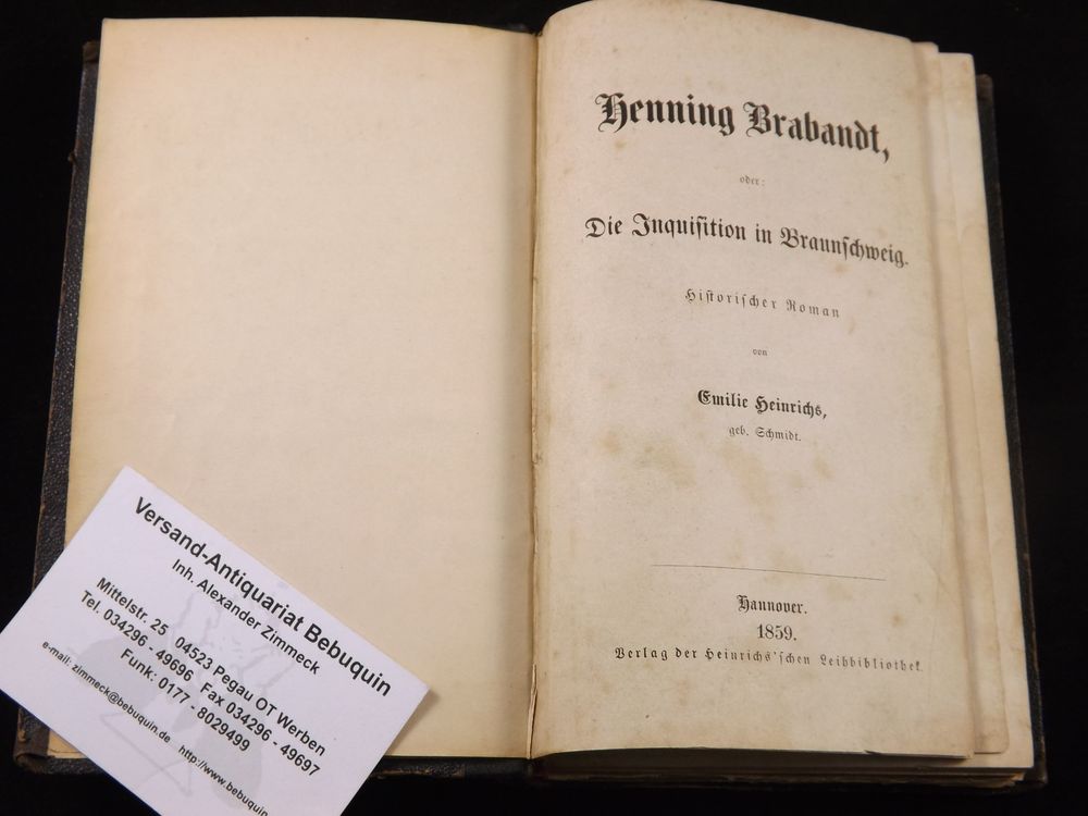 HEINRICHS, Emilie: Henning Brabandt, oder: Die Inquisition in Braunschweig. Hannover (Heinrichs), 1859. 576 S. HLdr. der Zeit. Rücken einseitig abgeplatzt, vorderes Gelenk gelockert, nur vereinzelt braunfleckig. seltene EA des Erstlingswerks. Emilie Heinrichs, geb. Schmidt, Ps. E. v. Linden, geboren den 1. März 1823 in Schleswig, lebte von 1845–1850 teils in Hamburg, teils in Altona und trat 1848 in Altona mit politischen Gedichten für Schleswig-Holsteins Befreiung ein. Nach ihrer Vermählung 1850 siedelte sie nach Hannover über. Sie führte in Hannover ein heiteres, fried- und freudevolles Familienleben, bis sie die politischen Verhältnisse von 1866 veranlassten, Hannover wieder zu verlassen. Sie vertauschte daher 1872 ihren langjährigen Wohnort mit Altona und siedelte 1878 nach Braunschweig über.