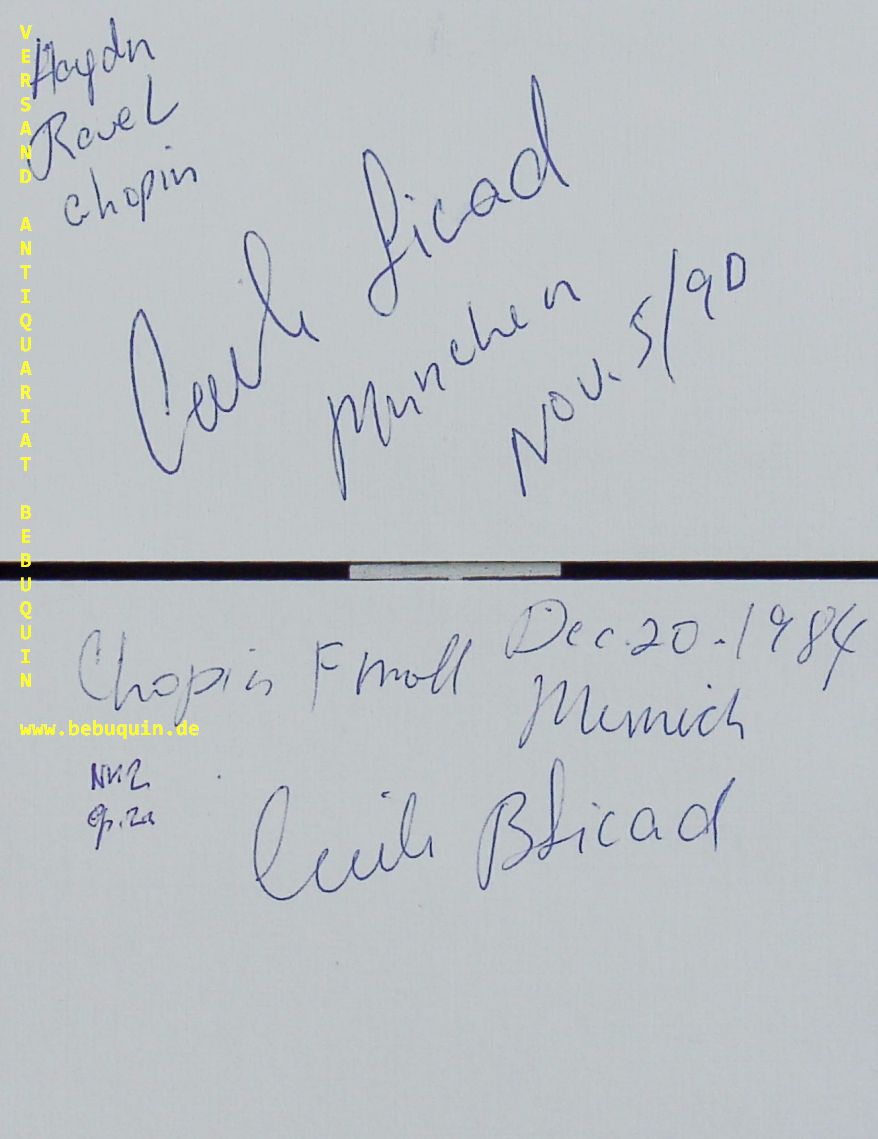 LICAD, Cecile (Pianistin): 2 eigenhändig signierte und datierte Autogrammkarten. München (Philharmonie), 20.12.1984 + 5.11.1990. 8 x 12,5 cm. 2 Karteikarte.
