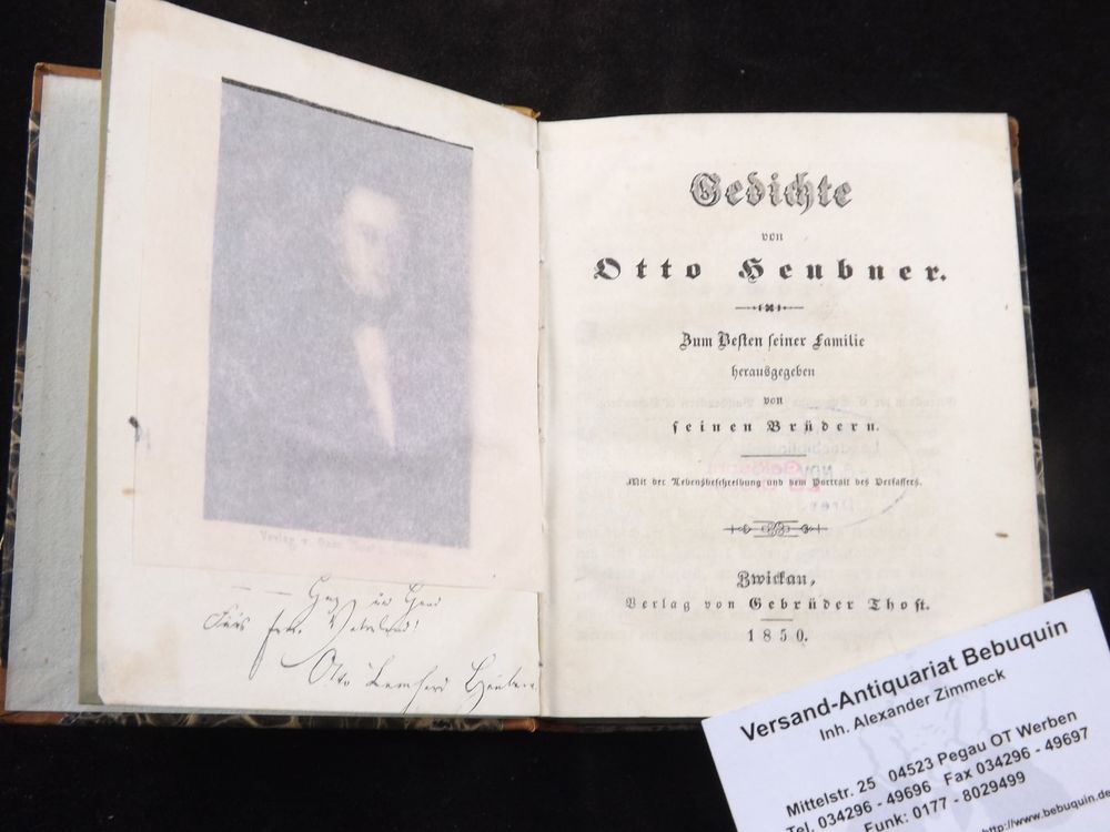 HEUBNER, Otto: Gedichte. Zum Besten seiner Familie hrsg. von seinen Brüdern. Zwickau (Thost), 1850. 12°. XLVII, 176 S. mit einem lithogr. Frontportrait mit Faks. HLdr. der Zeit. Titel verso mit altem Bibl.St. sonst gutes Ex. EA des Erstlingswerks Brümmer III, 194. Heubner war wegen der Teilnahme am Dresdener Aufstand von 1849 zum Tode verurteilt, dann aber zu lebenslanger Zuchthausstrafe begnadigt worden.