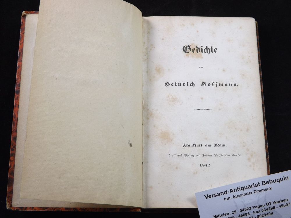 HOFFMANN, Heinrich: Gedichte. Frankfurt (Sauerländer), 1842. XIII S., 1 Bl., 222 S. Pb. der Zeit mit hands. Rückenschild, innen teils braunfleckig, sonst gut erhalten. Sehr seltene EA des Erstlings, der drei Jahre vor seinem Struwwelpeter erschien.