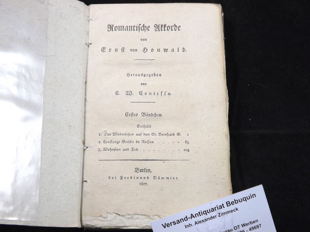 HOUWALD, Ernst von: Romantische Akkorde. Hrsg. v. C. W. Contessa 1. Bändchen (alles). Berlin (Dümmler), 1817. kl. 8°. 194 S. Pb. der Zeit, Kanten unbeschnitten EA des Erstlingswerks mit den drei Erzählungen: 1. Das Wiedersehen auf dem St. Bernhard. 2. Constanze Gräfin de Rossan. 3. Wahnsinn und Tod. WG² 1.