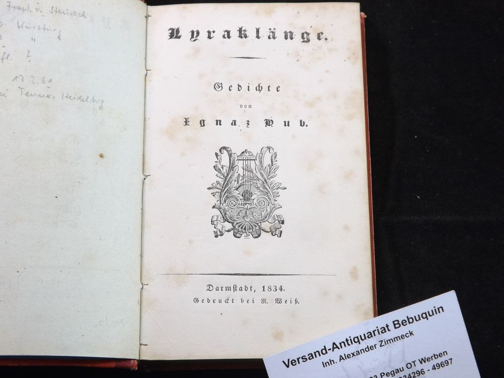 HUB, Ignaz: Lyraklänge. Gedichte. Darmstadt (Weiß), 1834. kl. 8°. 4 Bl., 160 S. mit Titelvignette und dreiseitigem Goldschnitt. HLdr. der Zeit mit goldgeprägtem Rücken. vereinzelt stockfleckig. EA des Erstlingswerkes Brümmer III, 303.