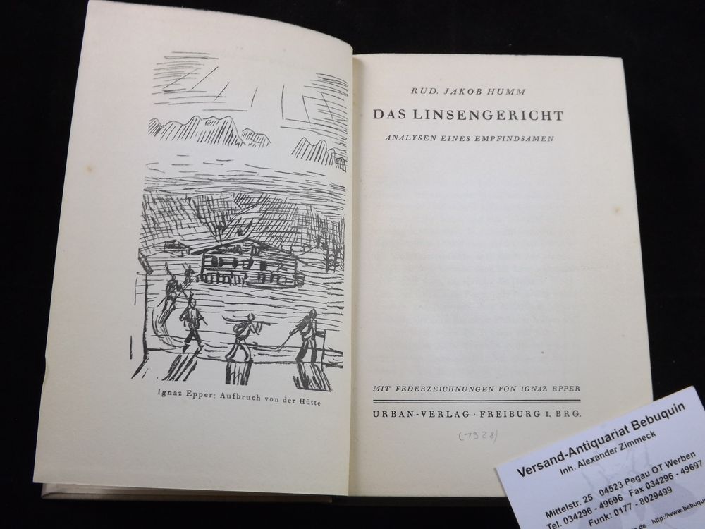 HUMM, Rudolf Jakob: Das Linsengericht. Analysen eines Empfindsamen. Freiburg (Urban), (1928.) 309 S. mit 20 Federzeichnungen von Ignaz Epper. OLn. Einband etwas stockig. EA der ersten Buchveröffentlichung.