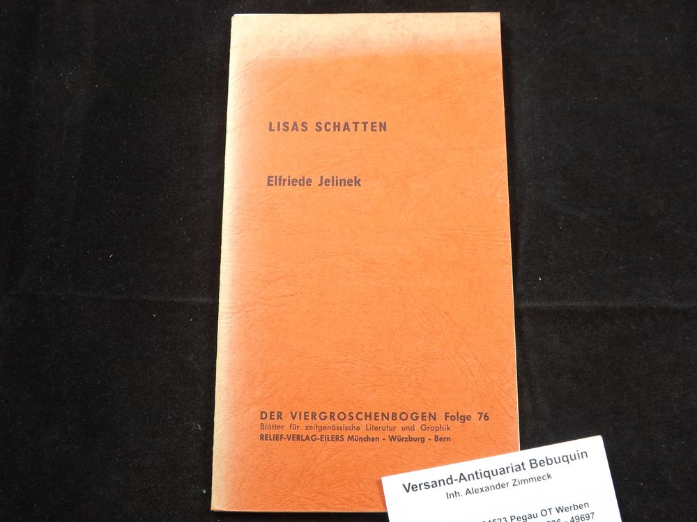 JELINEK, Elfriede: Lisas Schatten. München (Relief), 1967. 12 S. auf 3 losen Doppelbögen. roter OKart. leicht lichtrandig. = Der Viergroschenbogen Folge 76. EA der ersten Veröffentlichung der Nobelpreisträgerin.