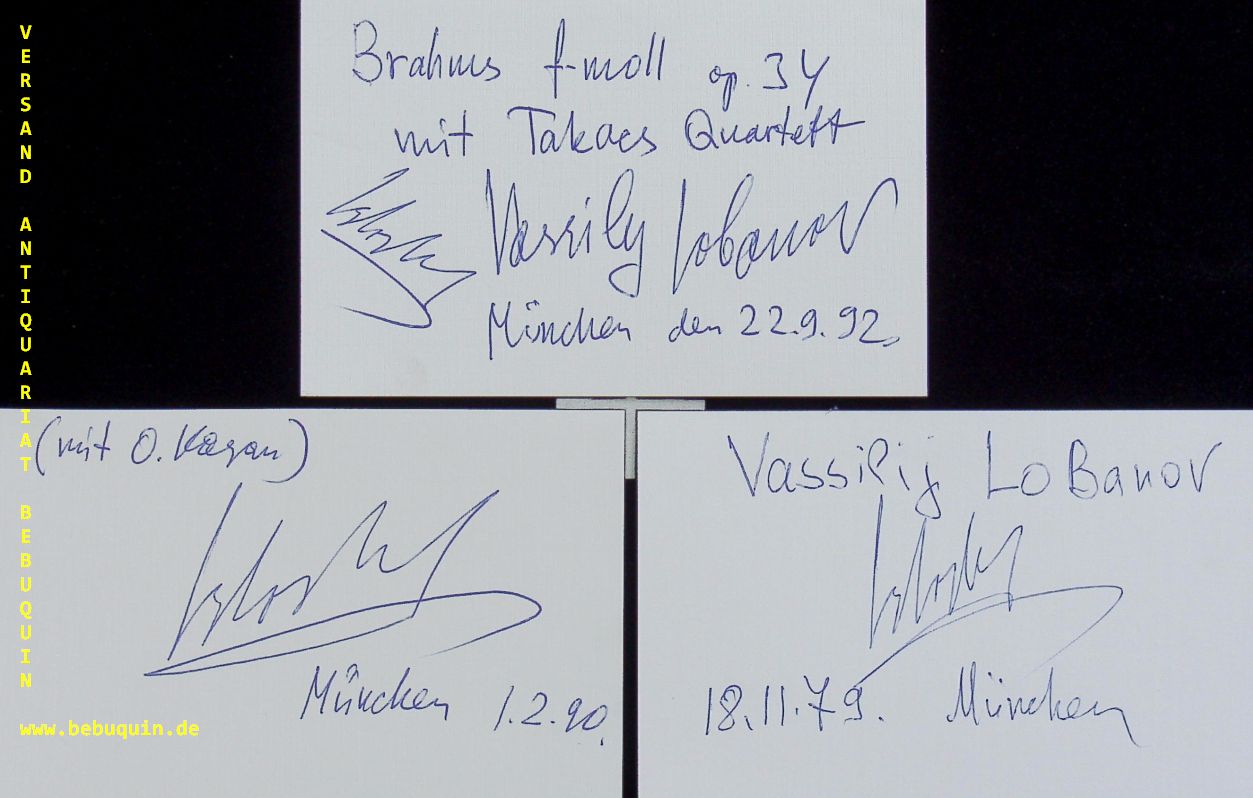 LOBONOW, Wassili (Pianist): 3 eigenhändig signierte und datierte Autogrammkarte. München (Philharmonie), 1979 – 1992. 8 x 12,5 cm. 3 Karteikarten. Vassily Lobanov (* 2. Januar 1947 in Moskau) ist ein russischer Pianist und Komponist. Er studierte von 1963 bis 1971 am Moskauer Konservatorium Klavier bei Lew Naumow und Komposition bei Sergei Balassanjan. Er studierte außerdem bei Juri Cholopow (Musikwissenschaft) und Alfred Schnittke (Instrumentation). (Wikipedia)