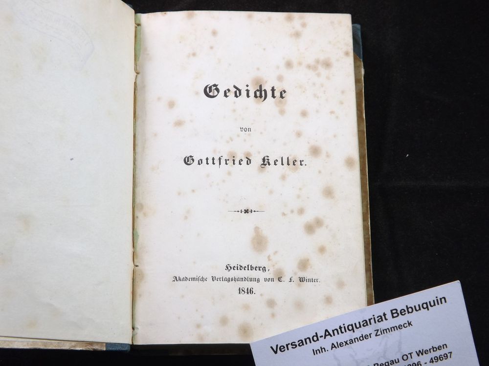 KELLER, Gottfried: Gedichte. Heidelberg (Winter), 1846. 12°. 1 Bl., 346 S. späteres HLn. mit goldgeprägtem Rücken. anfangs und am Ende stärker, sonst nur vereinzelt stockfleckig. EA der ersten Buchveröffentlichung WG² 4.