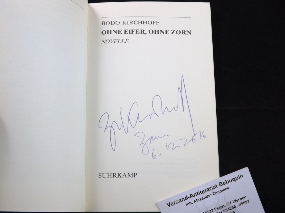KIRCHHOFF, Bodo: Ohne Eifer, ohne Zorn. Novelle. Frankfurt (Suhrkamp), 1979. 99 S. ill. OKart. EA des Erstlingswerks mit datierter Signatur des Verfassers auf Titelseite.