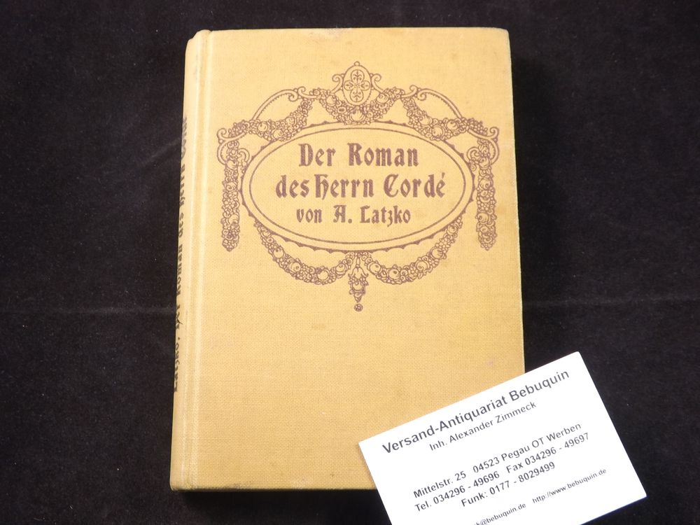 LATZKO, Andreas: Der Roman des Herrn Cordé. Berlin (Fleischel), 1906. kl. 8°. 147, 12 S. mit Buchschmuck von F. Arbeit. ill. OLn. leicht angeschmutzt, vorderes Gelenk etwas gelockert. 1 von 1000 Ex. der seltenen EA des Erstlingswerks Raabe 183.1.