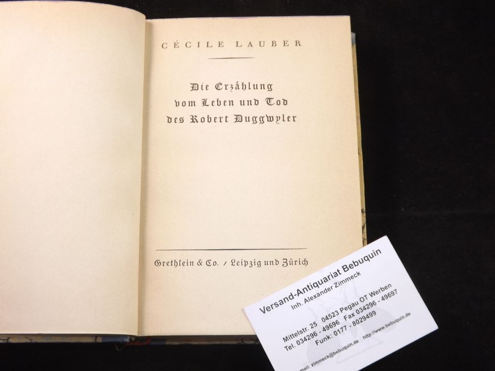 LAUBER, Cécile: Die Erzählung vom Leben und Tod des Robert Duggwyler. Leipzig (Grethlein), 1922. 332 (4) S. OHLn. Vorsätze gebräunt, sonst gut erhalten. seltene EA des Erstlingswerks. Cécile Lauber (* 13. Juli 1887 als Cécile Dietler in Luzern; † 16. April 1981 ebenda) war eine Schweizer Schriftstellerin. (Wikipedia)
