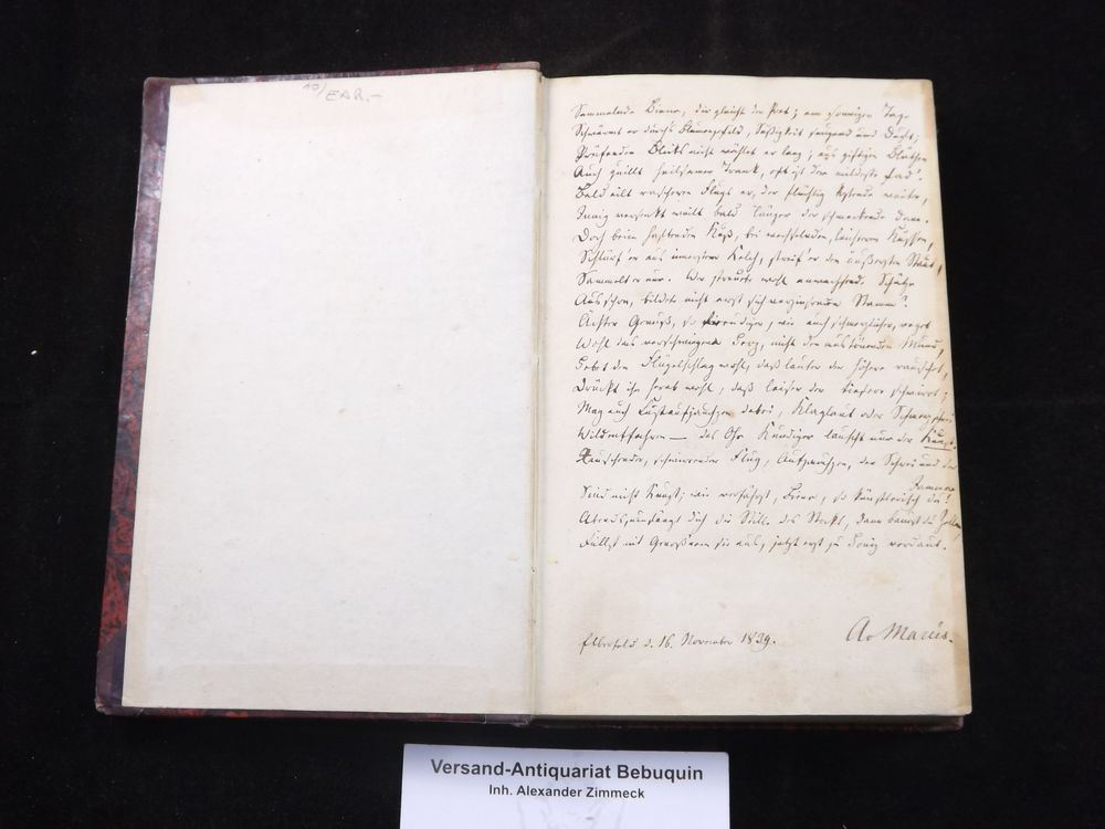 MARÉES, Adolph von: Die Askanier. Romanzen und Balladen. Zerbst (Kummer), 1836. 140 (1) S. HLdr. der Zeit mit goldgeprägtem Rücken. teils leicht stockfleckig. seltene EA des Erstlings des Vaters von Hans von Marees. Mit angebunden: Ders. Don Juan. A. d. Engl. des Lord Byron. Im Versmaaße des Originals übersetzt von A. von Marees. Bädeker, 1839. 4 Bl., 258 S. Die beiden ersten Veröffentlichungen in einem Band mit einem 20-zeiligen, eigenhändigen Gedicht von Adolpf von Marees auf dem Vorsatz, signiert und datiert.