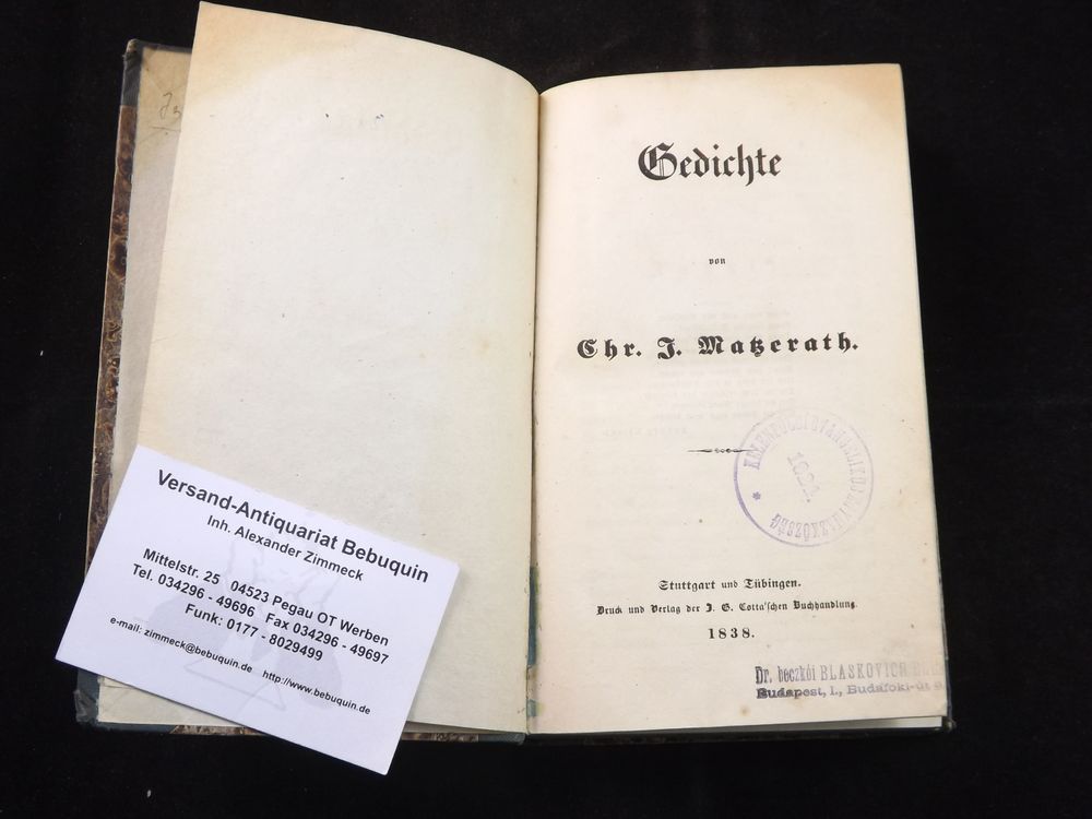MATZERATH, Chr. J.: Gedichte. Stuttgart (Cotta), 1838. kl. 8°. VI, 432 S. HLn. der Zeit mit goldgeprägtem Rücken. StaT. EA des Erstlings Kosch X, 572.