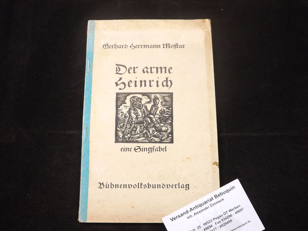 MOSTAR, Gerhard Herrmann: (d. i. Gerhart Herrmann) Der amre Heinrich. Eine Singfabel. Berlin (Bühnenvolksbund), 1928. 32 S. mit Titelholzstich und Noten. Interimsrücken. die beiden letzten Blätter mit Einriss. EA des Erstlingswerks WG² 1.