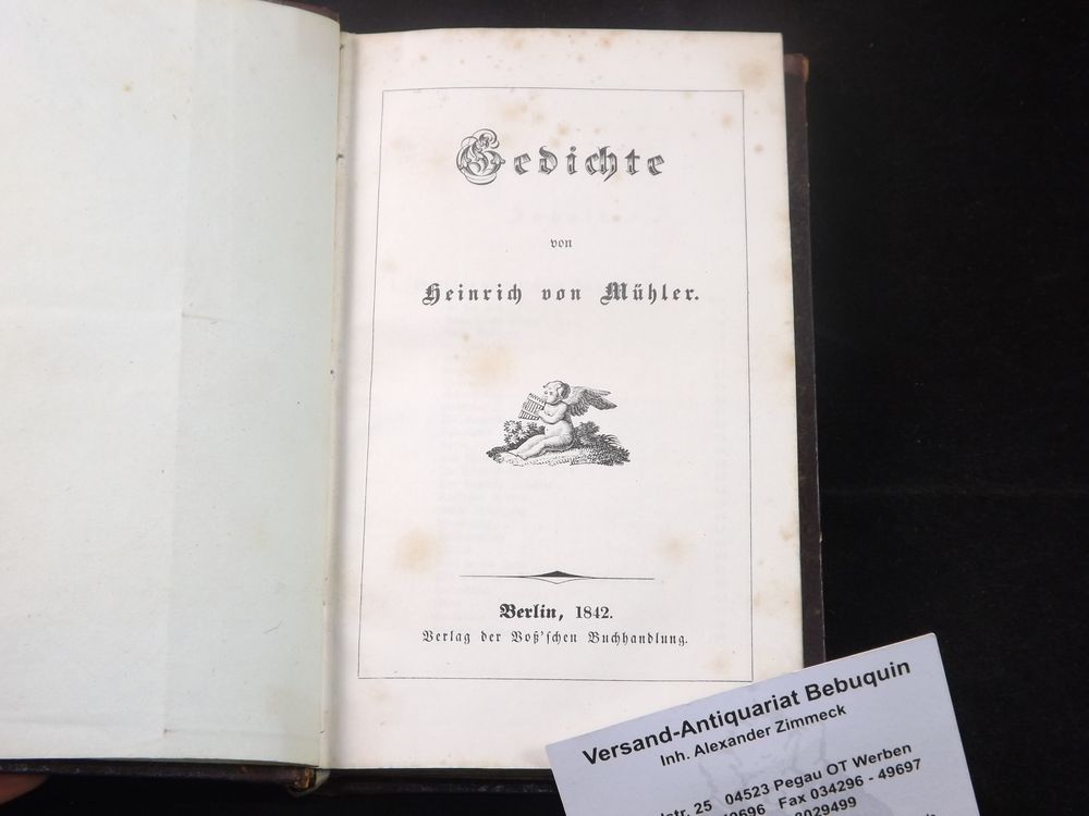 MÜHLER, Heinrich von: Gedichte. Berlin (Voß), 1842. kl. 8°. VI, 382 S. HLdr. der Zeit mit goldgeprägtem Rücken und blindgeprägtem Lackpapier-Deckelbezug. vereinzelt stockfleckig, sehr gutes Ex. EA des Erstlings. Heinrich Mühler, ab 1833 von Mühler (* 4. November 1813 in Brieg, Provinz Schlesien; † 2. April 1874 in Potsdam) war ein deutscher Jurist und Politiker. Er war Mitglied des Evangelischen Oberkirchenrats und von 1862 bis 1872 preußischer Kultusminister. (Wikipedia)