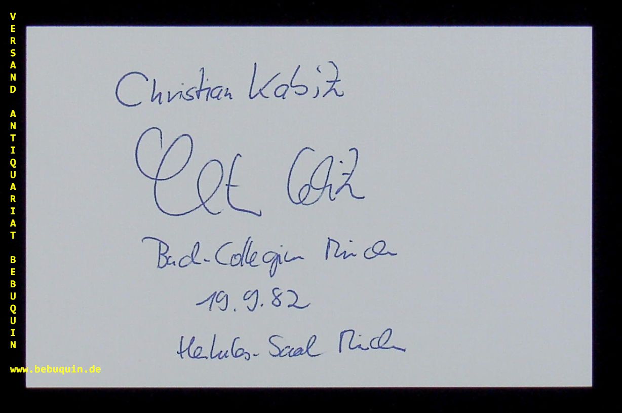 KABITZ, Christian (Komponist, Organist): eigenhändig signierte und datierte Autogrammkarte. München (Philharmonie), 1.9.1982. 8 x 12,5 cm. Karteikarte. Christian Kabitz (* 4. Mai 1950 in Nürnberg) ist ein deutscher Dirigent, Organist und Komponist. (Wikipedia)