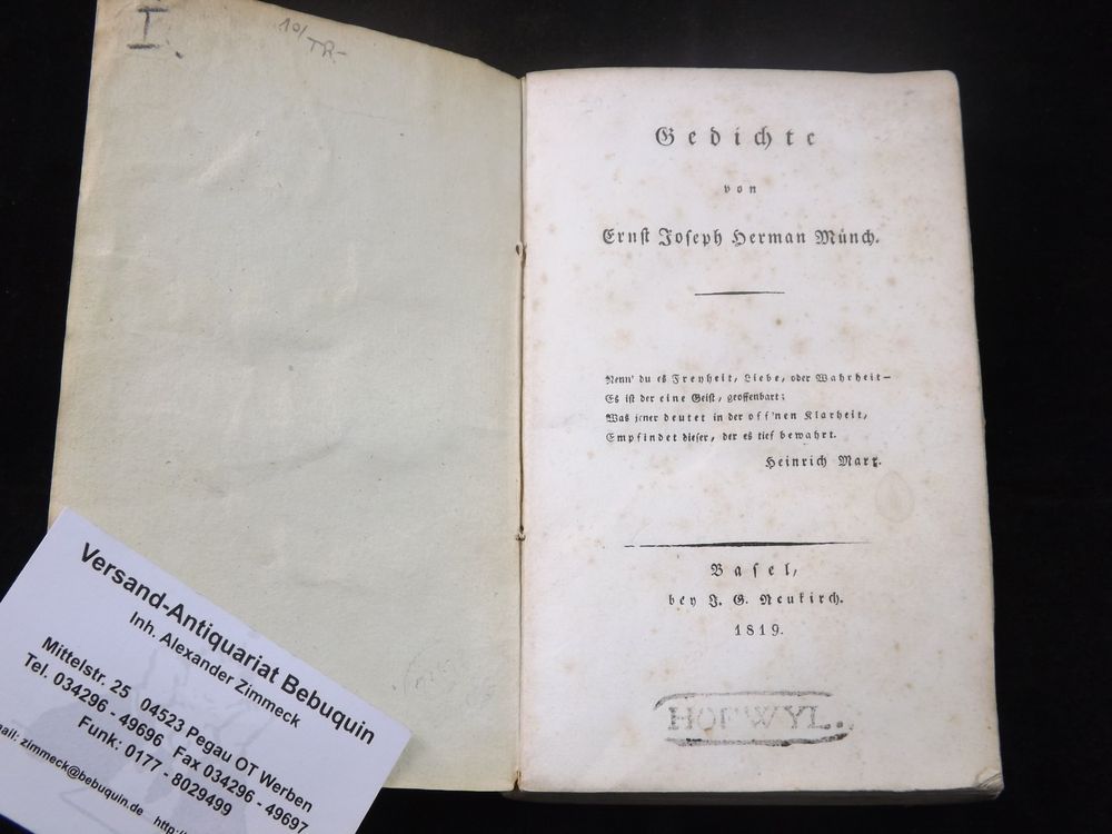 MÜNCH, Ernst Joseph Herman: Gedichte. Basel (Neukirch), 1819. kl. 8°. X, 316, 8 S. Kart. der Zeit. StaT, Rücken etwas rund gelesen. EA des Erstlingswerks.