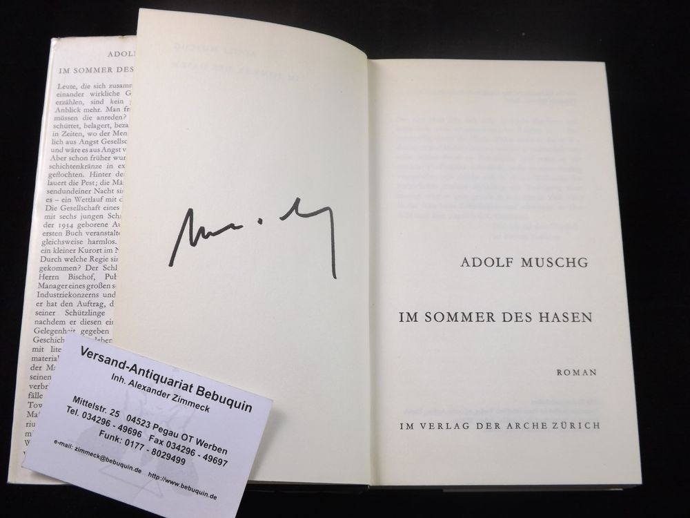 MUSCHG, Adolf: Im Sommer des Hasen. Roman. Zürich (Arche), 1965. 316 (3) S. OLn. mit OUmschl. EA der ersten selbständigen Veröffentlichung mit Verfassersignatur verso Titelseite.