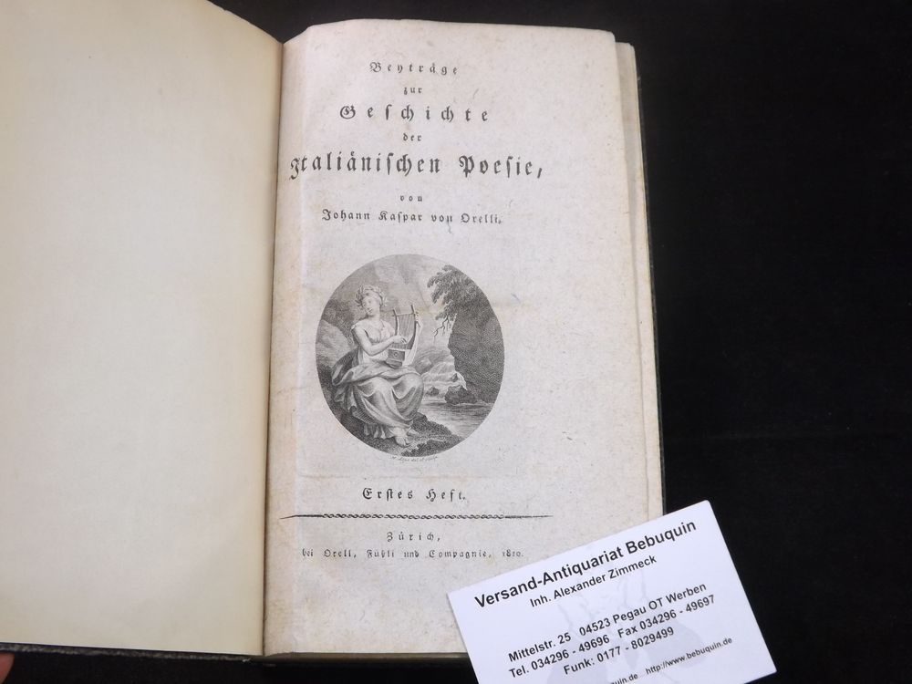 ORELLI, Johann Kaspar von: Beyträge zur Geschichte der italiänischen Poesie. Hefte 1-2 in 1 Bd. (so komplett). Zürich (Orell Füßli), 1810. 4 Bl., 148 S, 3 Bl., 140 S. mit gestochener Titelvignette in Medaillonform von Johann Heinrich Lips. Pb. der Zeit mit goldgeprägtem Rücken. Papier nur leicht gebräunt, Titel Heft 1 im Bug hinterlegt, gutes Ex. EA der ersten Buchveröffentlichung. Orelli, ein Nachkomme von Einwanderern aus Locarno, stammte aus einer vornehmen Tessiner Familie, die während der Reformation in Zürich Zuflucht gefunden hatte. Er studierte am Carolinum in Zürich Theologie. Anschließend hielt er sich für einen kurzen Zeitraum bei Johann Heinrich Pestalozzi in Yverdon auf. Pestalozzi war beeindruckt vom jungen Orelli. Von 1807 bis 1814 arbeitete er als Prediger in der reformierten Gemeinde von Bergamo, wo er Geschmack an der italienischen Literatur fand, was zur Publikation von Beiträgen zur Geschichte der italienischen Poesie (1810) und der Biographie (1812) von Vittorino da Feltre, seinem Ideal eines Lehrers, führte.