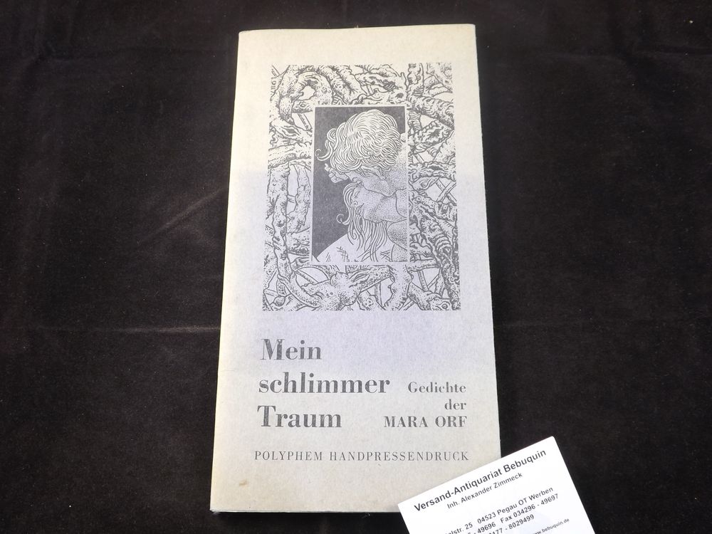 ORF, Mara: Mein schlimmer Traum. Gedichte. Berlin (Polyphem), 1968. 4°. 12 B l. mit 4 signierten Montagen aus 2 Grafiken von Gerd Ruppik als Blockbuch gebunden. O.Engl.Br. Rücken etwas geblichen. Nr.12 von 222 signierten und nummerierten Ex. der EA des Erstlingswerks. Spindler 94.11.
