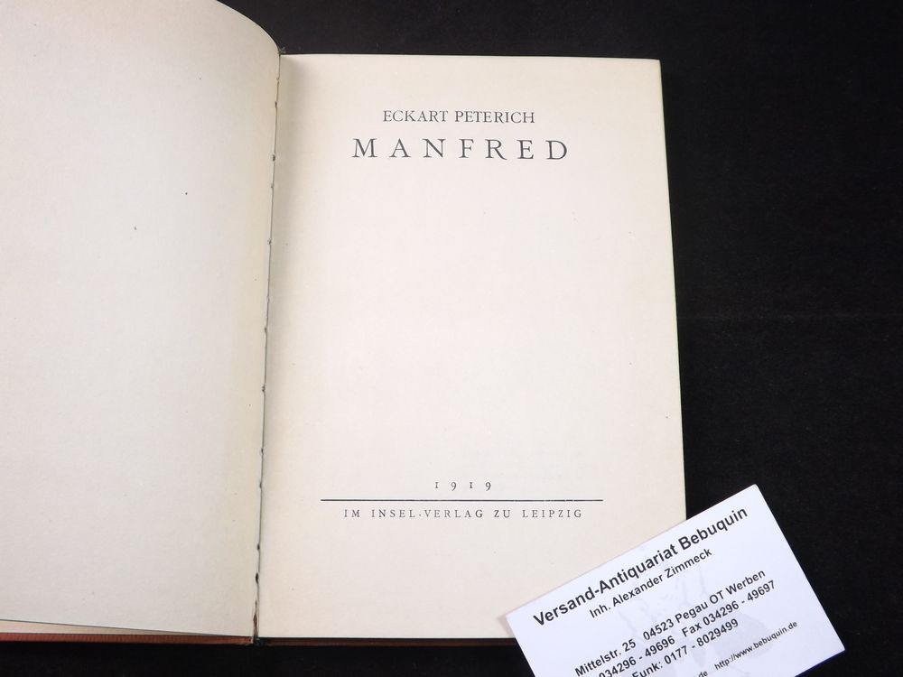 PETERICH, Eckart: Manfred. Leipzig (Insel), 1919. 95 S. OPb. mit Goldprägung von W. Thiemann. Rücken geblichen, Ex libris auf Innendeckel entfernt. seltene EA des Erstlings, nicht bei WG, Sarkowski 1230.