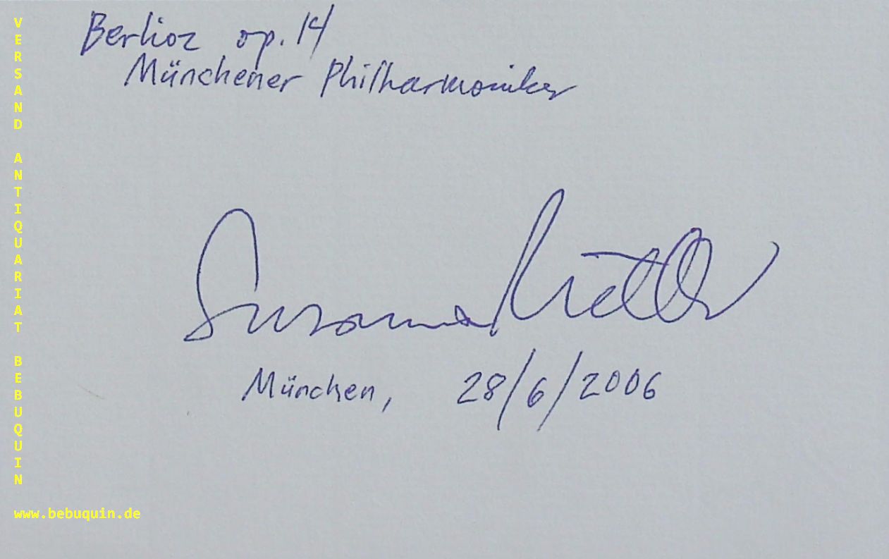 MÄLKKI, Susanna (Dirigentin): eigenhändig signierte und datierte Autogrammkarte. München (Philharmonie), 28.6.2006. 8 x 12,5 cm. Karteikarte. Susanna Mälkki (* 13. März 1969 in Helsinki) ist eine finnische Dirigentin. Sie ist gegenwärtig Erste Gastdirigentin des Gulbenkian-Orchesters Lissabon. Seit 2016 ist sie Chefdirigentin der Helsinkier Philharmoniker. (Wikipedia)
