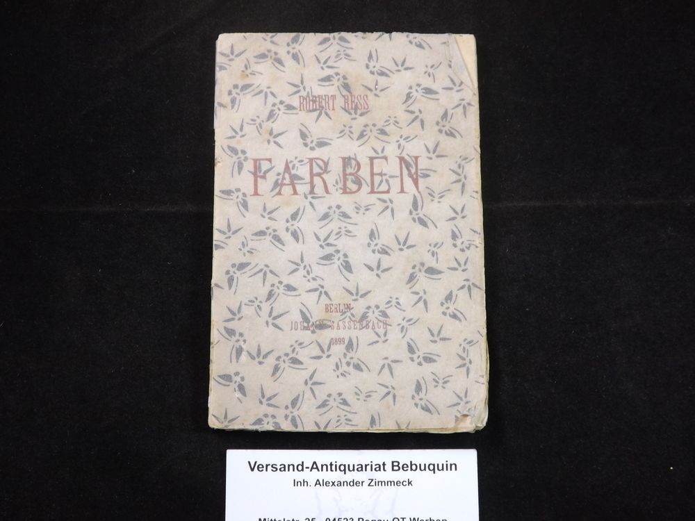 RESS, Robert: Farben. Berlin (Sassenbach), 1899. 12°. ca 50 ungezählte S. ill. OSeidenpapier. vordere Umschlagseite teils gelöst. Sehr seltene EA des Erstlings und wohl der einzigen Veröffentlichung des Freundes von Paul Ernst und Arno Holz, mit denen Ress in der Pariserstr. im damaligen Potsdam im Dichterwettstreit lag.