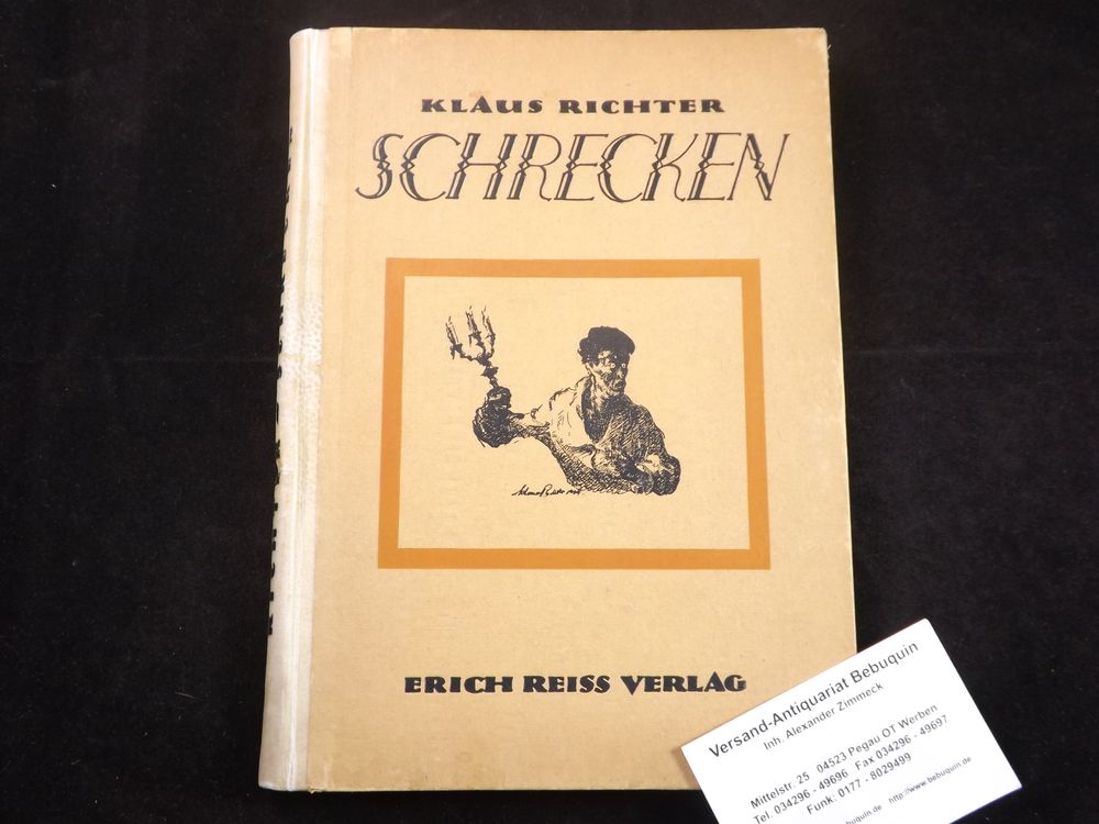 RICHTER, Klaus: Schrecken. Novellen und Federzeichnungen. Berlin (Reiss), 1919. Gr. 8°. 91 (1) S. mit 15 mont. Abb. nach Federzeichnungen auf Tafeln. ill. OHPrgt. etwas gebräunt, Rückdeckel mit Druckspuren. Nr. 205 von 1100 nummerierten Ex. der EA des Erstlings.