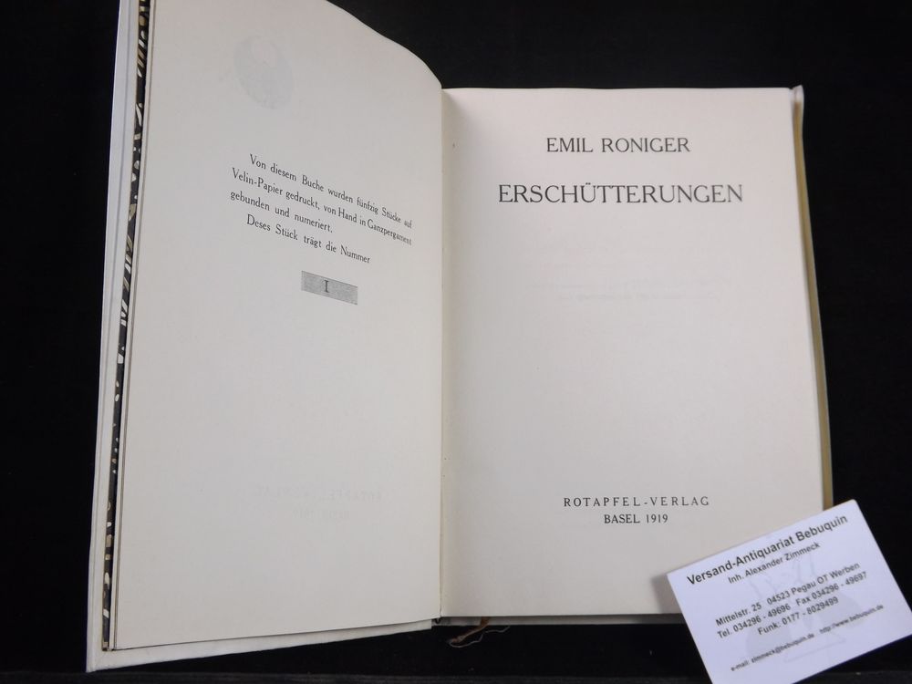 RONIGER, Emil: Erschütterungen. Basel (Rotapfel), 1919. Gr. 8°. 121 S., 2 Bl. mit dreiseitigem Goldschnitt. OPrgt. mit goldgeprägtem Rücken. Nr. 1 von 50 Ex. der Vorzugausgabe des Erstlingswerks.