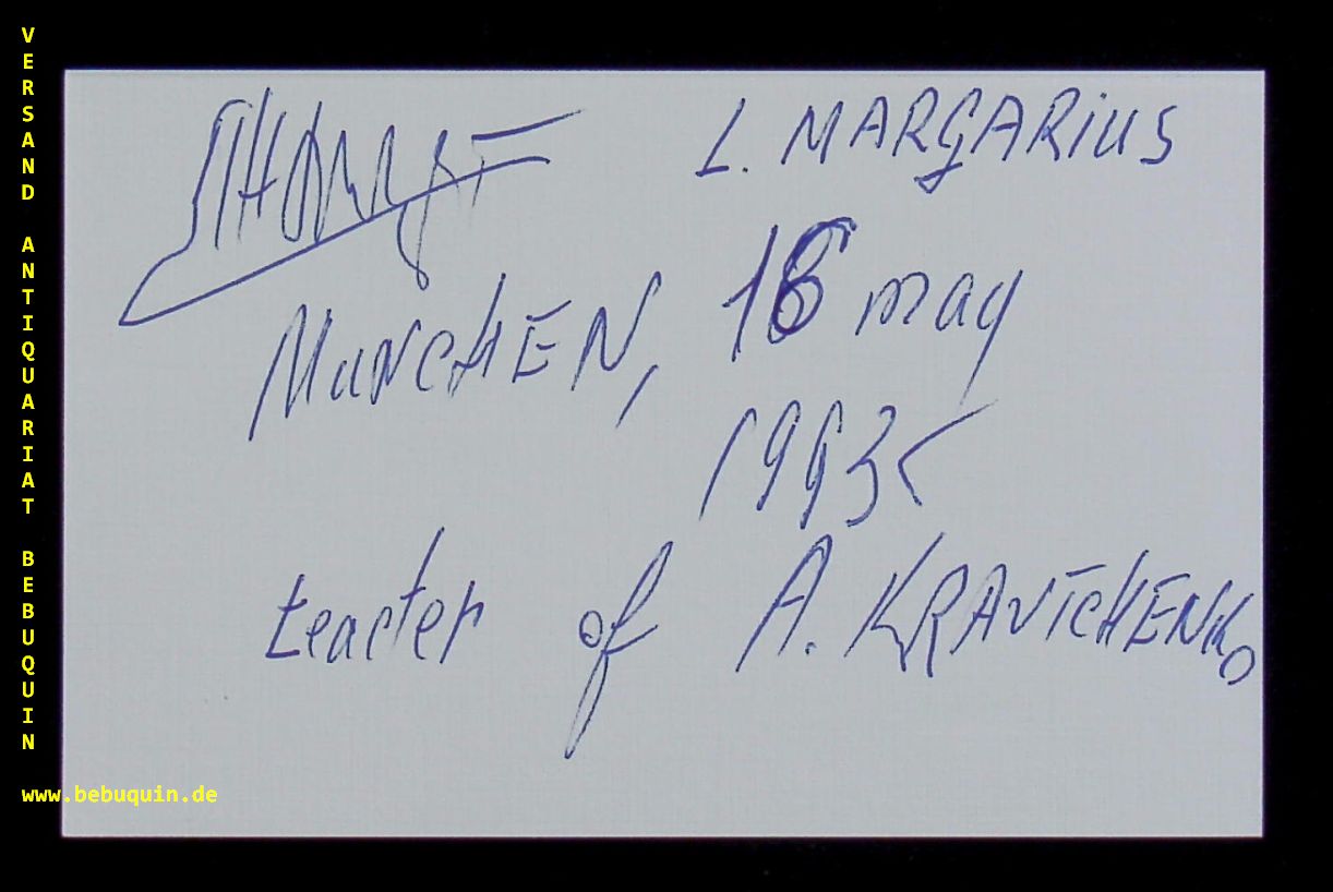 MARGARIUS, Leonid (Pianist + Lehrer von Anna Kravtchenko): eigenhändig signierte und datierte Autogrammkarte. München (Philharmonie), 16.5.1993. 8 x 12,5 cm. Karteikarte. Leonid Margarius is born in the Ukraine, there he received a specialized musical education, developing his talent under the guidance of Regina Horowitz in the town of Kharkov. (Wikipedia)