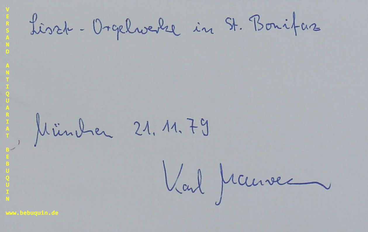 MAUREEN, Karl (Organist): eigenhändig signierte und datierte Autogrammkarte. München, 21.11.1979. 8 x 12,5 cm. Karteikarte. Karl Maureen (* 1938 in Aspertsham bei Trostberg) ist ein deutscher Organist. Er war bis 2006 Professor für Orgelliteraturspiel und Leiter des Fachbereichs Kirchenmusik zunächst an der Hochschule für Musik Nürnberg-Augsburg, dann am Leopold-Mozart-Zentrum in Augsburg. (Wikipedia)