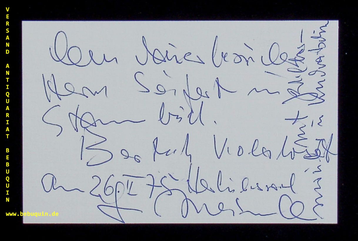 MEINECKE, Siegfried (Bratschist): eigenhändig signierte und datierte Autogrammkarte: Der Mauerbesucher Herrn Seifert ins Stammbuch. München (Herkulessaal(, 26.2.1975. 8 x 12,5 cm. Karteikarte. Siegfried Meinecke (13 January 1916 – 30 November 2015) was a German violist and music professor.