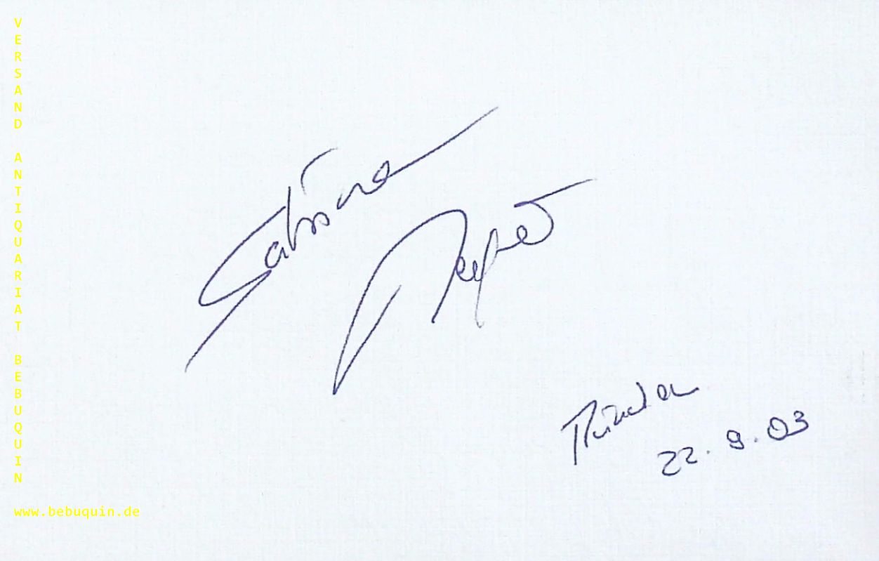 MEYER, Sabine (Klarinettistin): eigenhändig signierte und datierte Autogrammkarte. München (Philharmonie), 22.8.2003. 8 x 12,5 cm. Karteikarte. Sabine Meyer (* 30. März 1959 in Crailsheim) ist eine deutsche Klarinettistin, die international als Solistin auftritt und weltweit zu den renommiertesten Intrumentalsolisten überhaupt gerechnet wird. Zudem ist sie Professorin für Klarinette und Kammermusik an der Musikhochschule Lübeck. (Wikipedia)