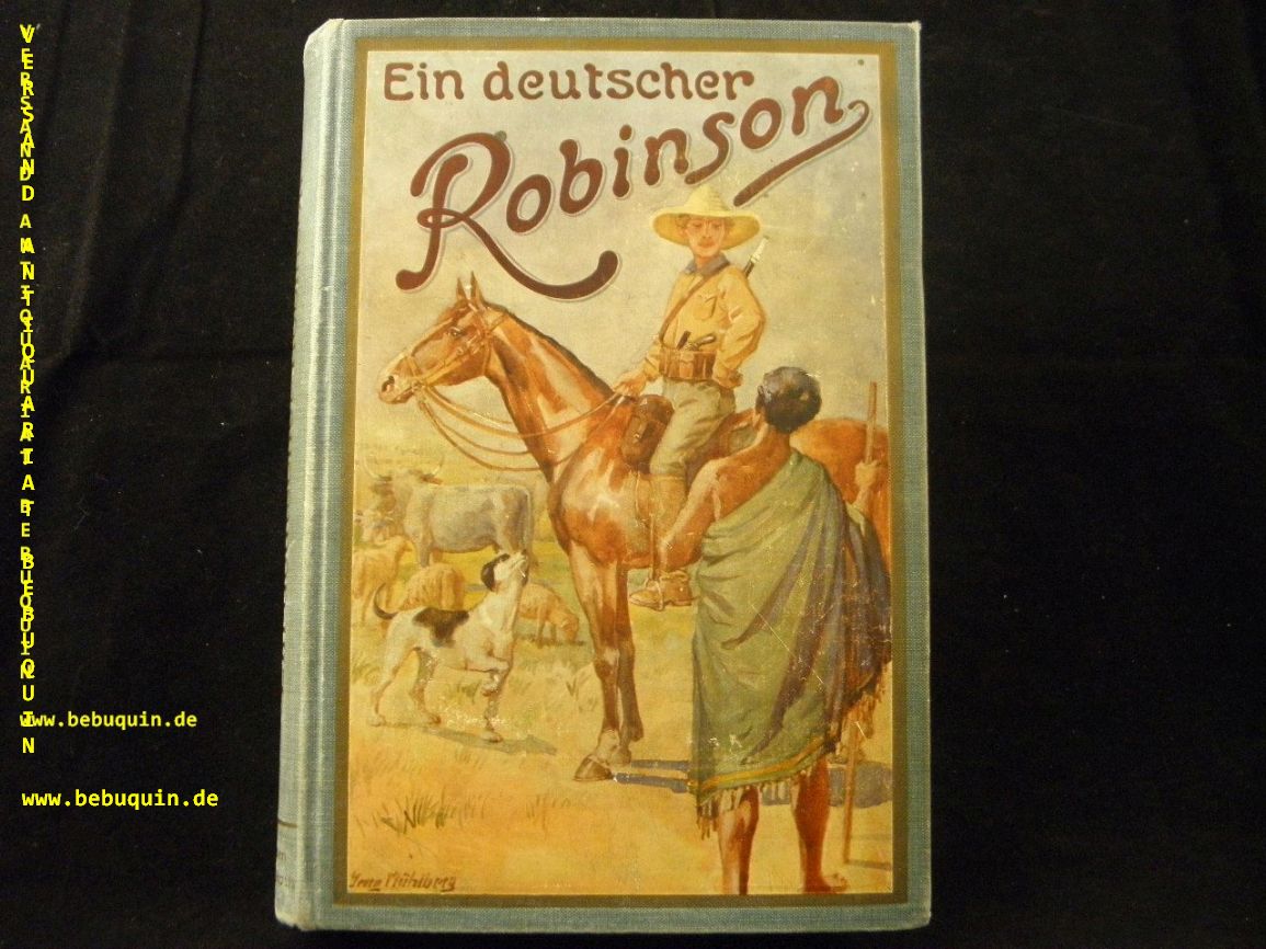 HARTMANN, Ernst: (Hrsg.) Ein deutscher Robinson. Gießen (Roth), (1912). Gr. 8°. 237 (2) S. mit 4 Aquarellbildern von E. Mühlberg. farb. ill. OHLn. EA Klotz 2356/1.