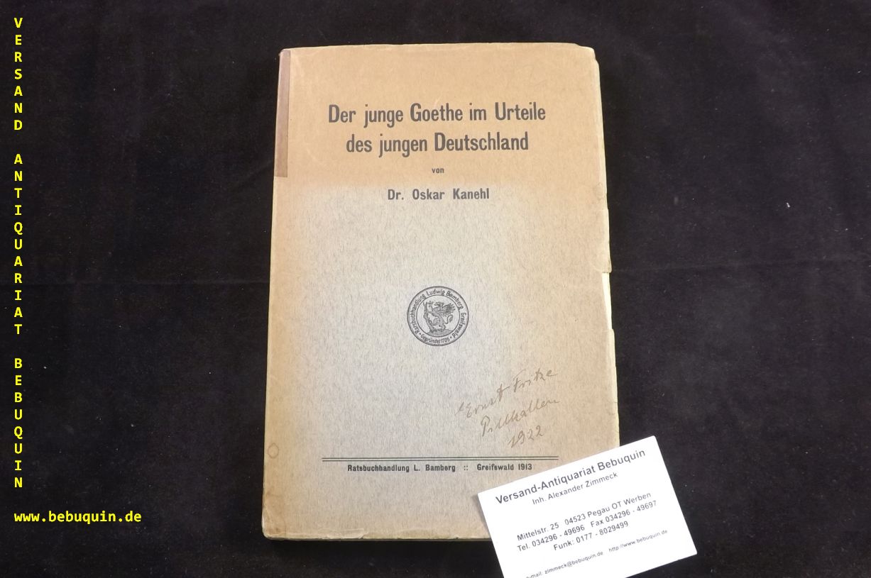 KANEHL, Oskar: Der junge Goethe im Urteile des jungen Deutschland. Greifswald (Bamberg), 1913. Gr. 8°. 174 S., 1 Bl. OKart. Kanten bestoßen, NaU, Rücken teils überklebt. EA des Erstlingswerks des Kampfgefährten von Franz Pfemfert und Gründer der Gruppe „Romantische Revolutionäre.“