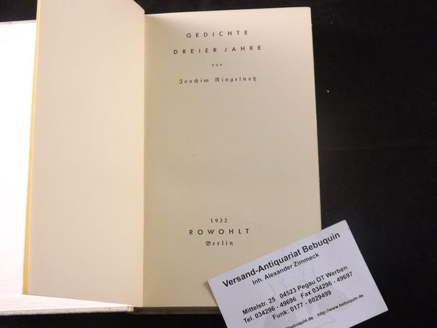 RINGELNATZ, Joachim: Gedichte dreier Jahre. Berlin (Rowohlt), 1932. 134 S. OLn. gutes Ex. EA WG² 34.