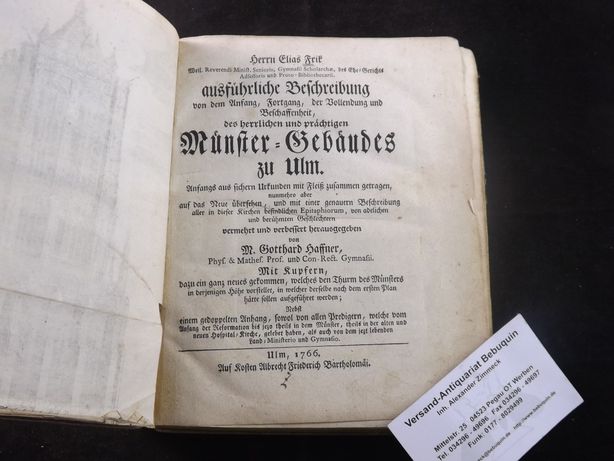ULM.– FRIK, Elias: Ausführliche Beschreibung von dem Anfang, Fortgang, der Vollendung und Beschaffenheit, des herrlichen und prächtigen Münster-Gebäudes zu Ulm. Anfangs aus sichern Urkunden mit Fleiß zusammen getragen, nunmehro aber auf das Neue übersehen, und mit einer genauern Beschreibung aller in dieser Kirchen befindlichen Epitaphiorum, von adelichen und berühmten Geschlechtern vermehret und verbessert herausgegeben von Gotthard Haffner. Mit Kupfern [hier leider fehlend!] Nebst einem gedoppelten Anhang, sowol von allen Predigern, welche vom Anfang der Reformation bis jezo theils in dem Münster, theils in der alten und neuen Hospital-Kirche, gelebet haben, als auch von dem jezt lebenden Land-Ministerio und Gymnasio. Ulm (Bartholomäi), 1766. 7 Bl., 132 S., 2 Bl. + 5 gefalteten Kupferstcihen. Pb der Zeit. Einband stärker angeschmutzt, NaV, die erste Bildtafel am unteren Blattrand ca 2 cm beschädigt, sonst sehr ordentlich. seltene EA.