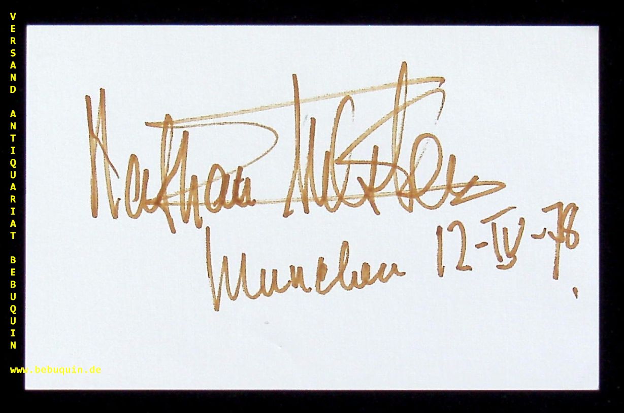 MILSTEIN, Nathan (Violinist): eigenhändig mit Gelbstift signierte und datierte Autogrammkarte. München, 14.4.1978. 8 x 12,5 cm. Karteikarte. schönes Ex. Nathan Milstein (* 31. Dezember 1903 † 21. Dezember 1992 in London) war ein amerikanischer Violinist ukrainischer Herkunft. Er gilt als einer der größten Geiger des 20. Jahrhunderts. (Wikipedia)