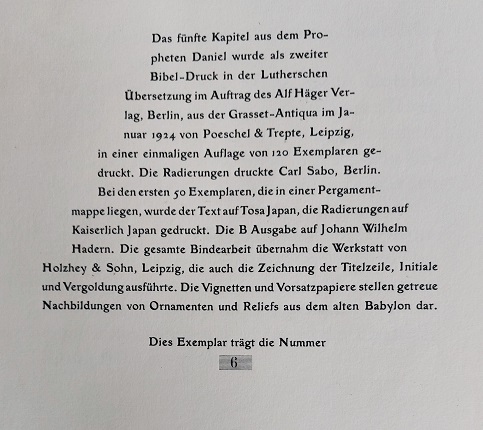 DANNEMANN, Karl: Belsazer. Des Propheten Daniel fünftes Kapitel. Berlin (Alf Häger), 1924. Fol. 5 Bl. mit farb. Abb. + 10 einzeln mit Bleistift signierten Radierungen unter Passe Partout in illustrierter OPrgtMappe mit leinenkaschierten Innenflächen in OSchuber Schuber an einer Seite aufgeplatzt, sonst sehr feines Ex. Nr. 6 von 50 Ex. (Gesamtauflage 120). Museal. Bei dieser Vorzugsausgabe wurden der Text auf Tosa Japan und die Radierungen von Carl Sabo auf Kaiserlich Japan gedruckt. Die Bindearbeit sowie die Textabbildungen und die Vergoldung übernahm die Werkstatt Holzhey & Sohn in Leipzig. Karl Dannemann war Meisterschüler von Max Slevogt. In den 1920er Jahren realisierte er in Bremen einige seiner markantesten Werke. Er schuf die Fresken im Bacchuskeller des Bremer Ratskellers, das Gemälde Hindenburg-Bankett im Bremer Rathaus, sowie diverse Bühnenbilder, Porträts, Seestücke, Stillleben, Stadt- und Landschaftsbilder. In den 1930er und 1940er Jahren betätigte sich Dannemann als Schauspieler beim Film, wo er in insgesamt über 50 Produktionen mitwirkte, in Unterhaltungsfilmen gleichermaßen wie in nationalsozialistischen Propagandafilmen. Vom Kriegseinsatz war er als unabkömmlich befreit worden und stand auf der Gottbegnadeten-Liste. Dannemann schied 1945 im Alter von 49 Jahren freiwillig aus dem Leben, um sich der Gefangennahme durch sowjetische Truppen zu entziehen. (Wikipedia)