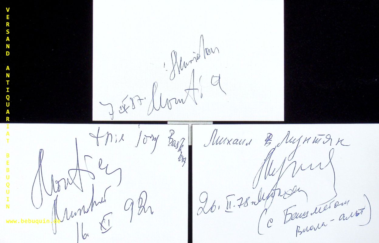 MUNTJAN, Mikhail (Pianist): 3 eigenhändig signierte und datierte Autogrammkarten. München (Philharmonie), 1978 + 1987 + 1992. 8 x 12,5 cm. 3 Karteiklarten.