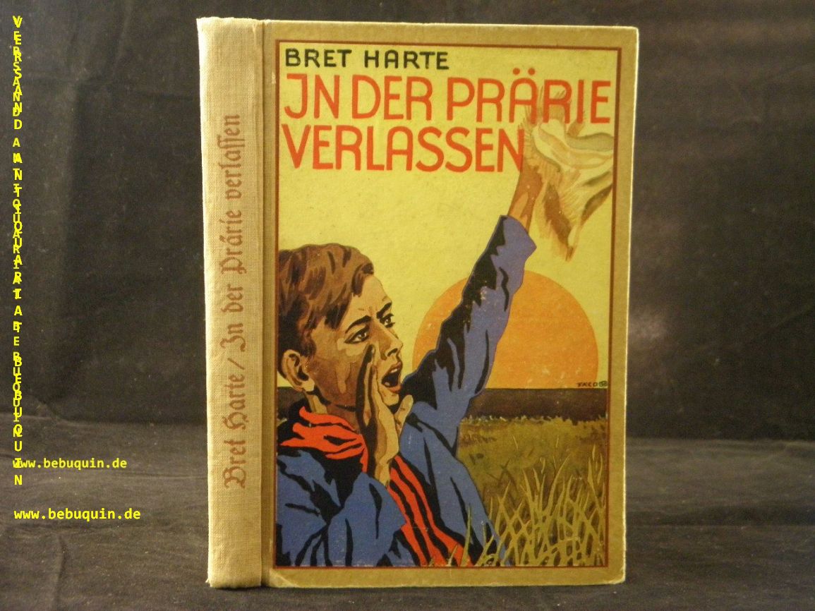 HARTE, Bret: In der Prärie verlassen. D.v. Emmy Becher. Stuttgart (Weise), ca 1920. 154 (6) S. mit 1 farb. Titelbild. farb. ill. OHLn von Jacobs. bemerkenswerte Einbandillustration. 1. Aufl. dieser Ausgabe. Nicht bei Klotz.