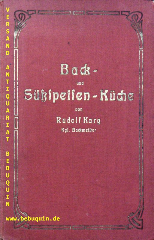 KOCHBÜCHER.– KARG, Rudolf: Back- und Süß-Speiseküche. Illustriertes Handbuch für Köche, Konditoren und Hausfrauen. Reiche Sammlung selbsterprobter Rezepte und des Neuesten aus der Praxis. 2. vermehrte Aufl. Nordhausen (Killinger), 81909). XVI, 156 (6) S. mit zahlr. Abb. OLn. mit Goldprägung. kaum gebräunt.