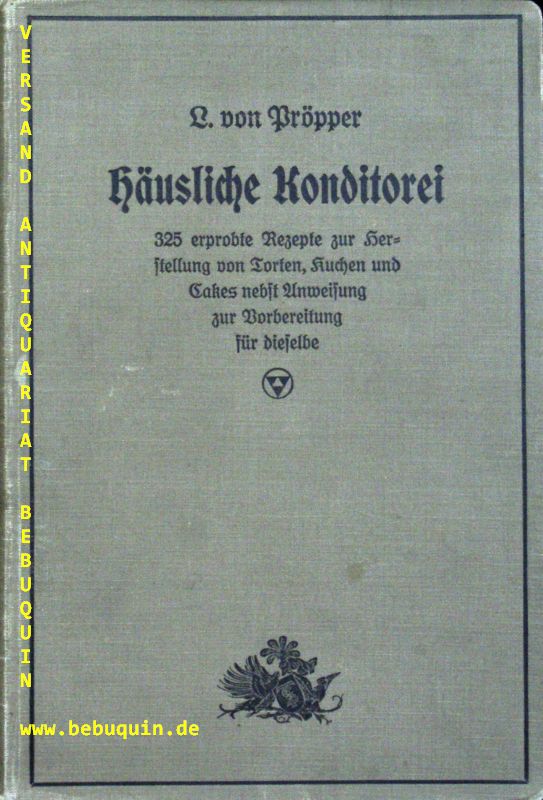 KOCHBÜCHER.– PRÖPPER, L. von: Häusliche Konditorei. 325 erprobte Rezepte zur Herstellung von Torten, Kuchen und Cakes nebst Anweisung zur Vorbereitung für dieselbe. Neu bearb. von M. Breithaupt. 4. Aufl. Frankfurt a.d. Oder (Trowitzsch), 1910. Gr. 8°. 2 Bl., 106 (2) S. OLn.